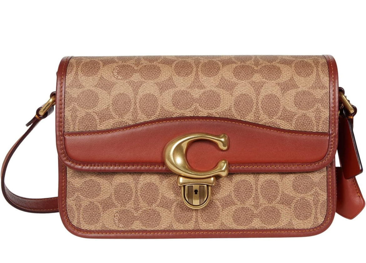 - Signature coated canvas and refined calf leather for a classic Coach look